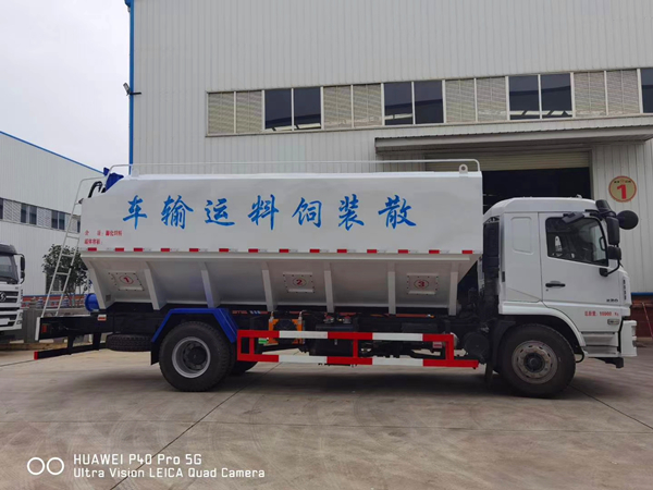 散裝飼料運(yùn)輸車主要用于從飼料廠向畜牧場養(yǎng)禽場及飼料加工用戶運(yùn)輸散裝飼料成品或飼料生產(chǎn)原糧,同時(shí)它也可用來運(yùn)輸某些無腐蝕性粉粒狀原料,如制藥廠粉料和糧庫周轉(zhuǎn)。散裝飼料車的飼料罐架設(shè)在卡車的底盤上,罐頂開有進(jìn)料口.頂部的一根螺旋輸送卸料管(俗稱卸料絞龍)則可自由回轉(zhuǎn)和抬升,抬升的仰角可達(dá)60度。運(yùn)輸時(shí),頂部的螺旋管平臥在罐頂;卸料時(shí)則抬起,使管端的出料口與畜禽飼養(yǎng)場貯料罐頂部的進(jìn)料門相接,駕駛室內(nèi)裝有操縱裝置(操縱裝置也可裝置在罐體尾部),卸料時(shí)通過車底的動(dòng)力輸出軸和減速器來驅(qū)動(dòng)螺旋,以完成卸料。目前國內(nèi)主要推出3T、5T、8T、11T、15T和22T等多個(gè)噸位車型。
