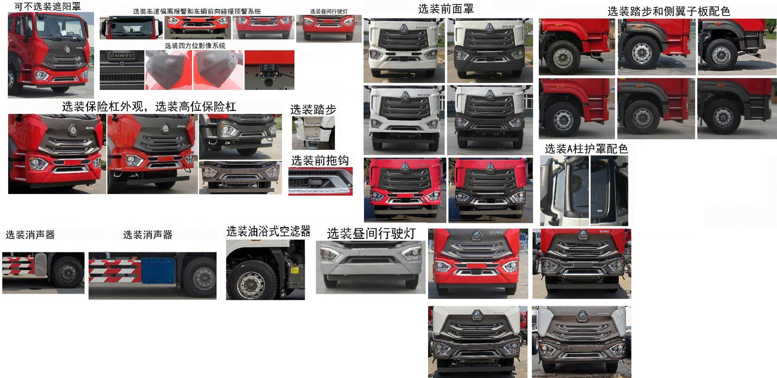 浴式空濾器,選裝消聲器,選裝前面罩,選裝側(cè)翼子板和踏步配色.發(fā)動(dòng)機(jī)凈功率值:199kW(MC07.27-60),210kW(MC07.29-60),215kW(WP7.300E61),225kW(MC07.31-60),237kW(MC07H.33-60),
