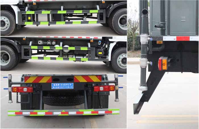 該車用途為城鄉道路和鐵路礦場的抑塵降霾,主要裝置為罐體及噴霧裝置.罐體總容量:13立方米,罐體有效容積:12.38立方米;罐體外形尺寸(長×長軸×短軸)(mm):4800×2450×1600.ABS系統生產廠家及型號分別為:西安正昌電子股份有限公司(型號:ZQFB-V).側、后防護材料均為:Q235碳鋼,連接方式均為:螺栓連接,后部防護截面尺寸(mm):120×50,后部防護離地高度(mm):470.僅采用底盤4500mm,4700mm軸距改裝.選裝前部不帶電子霧炮,選裝電子霧炮樣式.當前部不帶電子霧炮時,車輛長度8600mm,無前伸;當前部選裝電子霧炮時,車輛長度9100mm,前伸500mm.后軸僅采用鋼板彈簧懸架. |
