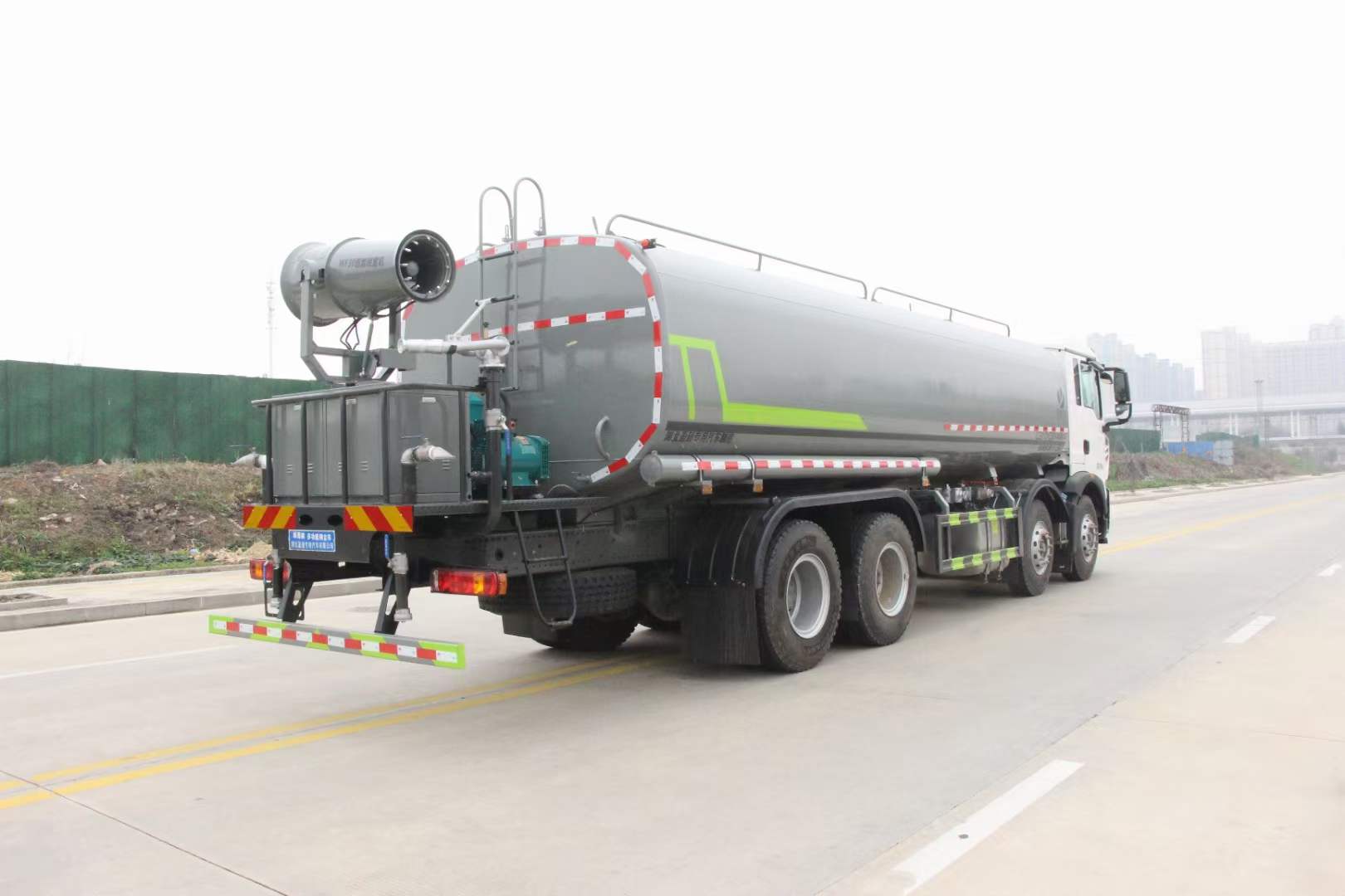 豪沃28方灑水車_重汽豪沃28方抑塵車_重汽曼350霧炮車_湖北盈通專用汽車有限公司,該車用途為城鄉道路和鐵路礦場的抑塵降霾,主要裝置為罐體及噴霧裝置.罐體總容量:22.6立方米,罐體有效容積:21.5立方米;罐體外形尺寸(長×長軸×短軸)(mm):7700×2480×1730.ABS系統控制器生產企業/型號為威伯科(上海)管理有限公司/4460046300;選裝EBS,EBS系統控制器生產企業/型號為威伯科(上海)管理有限公司/EBS3.側、后防護材料均為:Q235碳鋼,連接方式均為:螺栓連接,后部防護截面尺寸(mm):120×50,后部防護離地高度(mm):490.僅采用底盤1800+3800+1350軸距(mm)改裝.隨底盤選裝前面罩,選裝后處理樣式,選裝踏步樣式.選裝前部不帶電子霧炮,選裝前部電子霧炮樣式.當前部不帶電子霧炮時,車輛長度11550mm,無前伸;當前部選裝電子霧炮時,車輛長度12050mm,前伸500mm.后軸僅采用鋼板彈簧懸架.選裝自動球閥位置,選裝后對沖裝置,選裝罐體頂部高位花灑裝置,選裝前沖裝置樣式.隨底盤選裝駕駛室.選裝噴霧裝置樣式.選裝箭頭燈裝置,選裝方形罐口及罐口位置,選裝尾部自流口裝置,選裝工具箱裝置. |